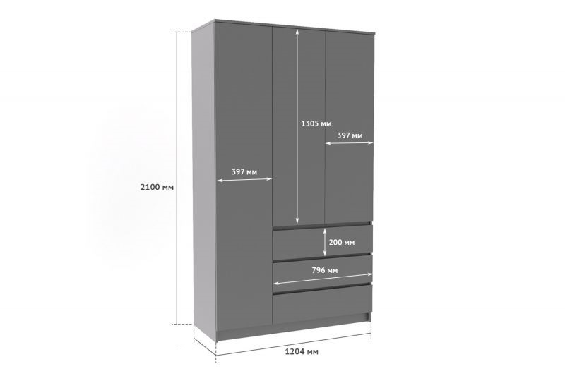 Шкаф для одежды, шкаф для платья и белья, шкаф с полками, распашной. Шкаф трехстворчатый с тремя ящиками, из модульной серии Мори. Размеры: ш 1204* г 478* в 2100 мм. Цвет: графит. Материал: ЛДСП. Производство: Пенза (ДСВ-Сол). Наполнение: за дверями штанга для одежды и 3 полки.