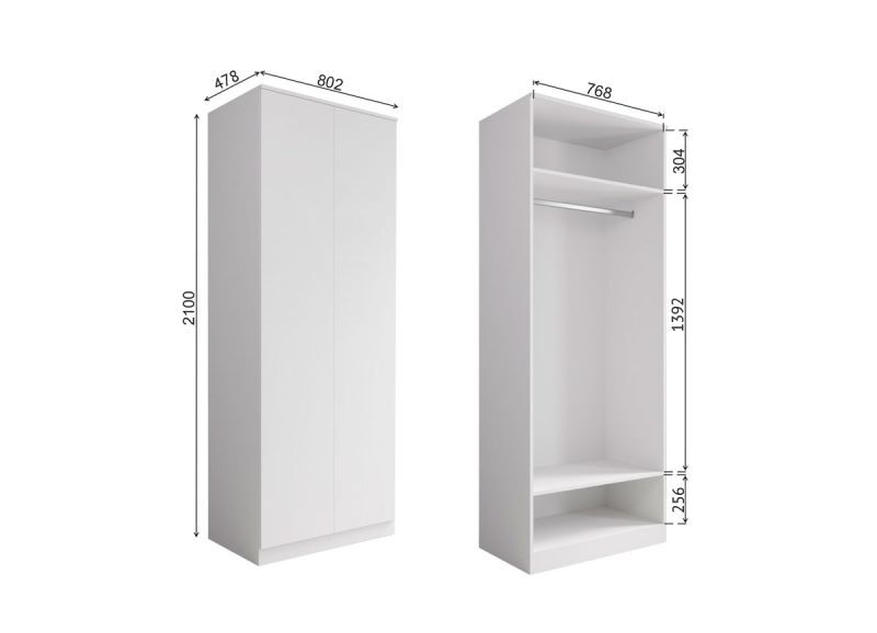 Шкаф со штангой для одежды двухдверный, шкаф для платья и белья, шкаф с полками, распашной. Из серии мебели для Мори. Размеры: ш 802* г 478* в 2100 мм. Цвет: белый. Производство- Пенза (ДСВ-мебель -Сол). Наполнение: полки. Упаковка: 3 уп.