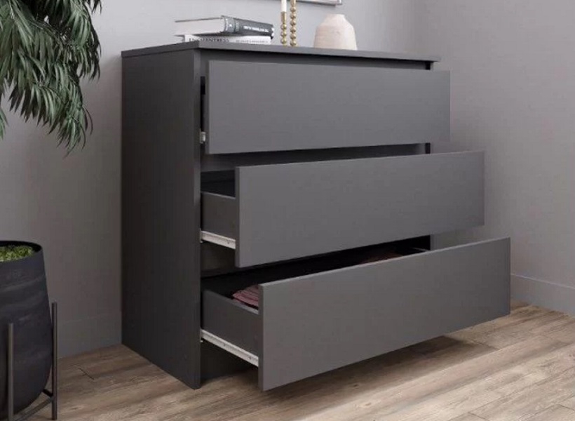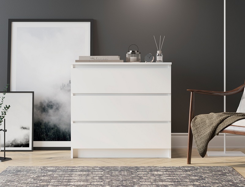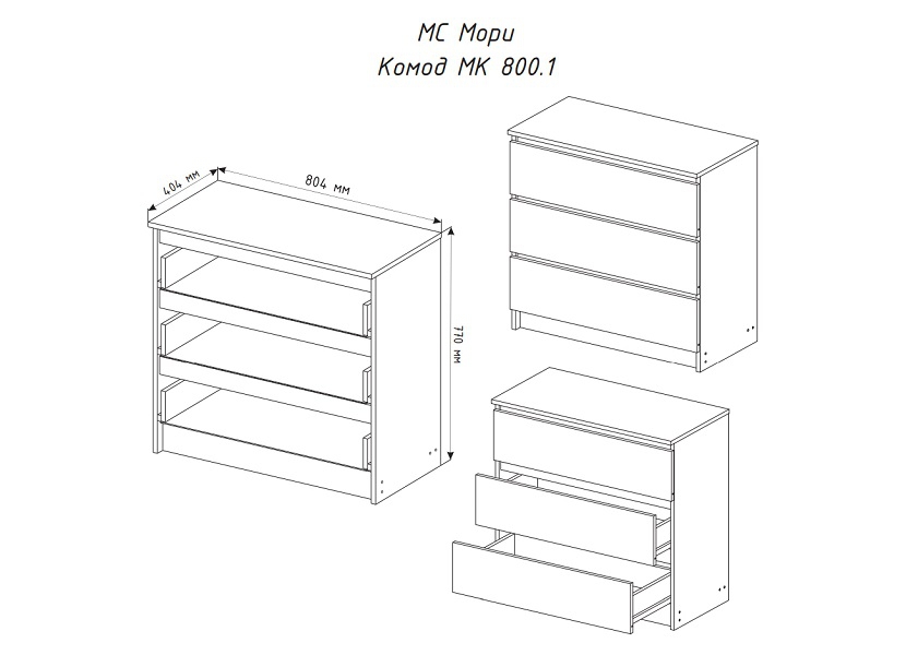 Вместительный комод на три ящика. Может служить тумбой. Выбор цвета: белый, графит. Производство – Пенза (ДСВ). Размеры: ш 804* г 390* в 773 мм. Материал: ЛДСП с кромкой ПВХ, роликовые направляющие. На фасадах ящиков отсутствуют ручки, функцию ручек выполняет сам фасад (его верхняя часть с внутренней стороны прямая под углом 90°). Открывание ящиков производится за счет пространства между планками и фасадом. Упаковка: 30 кг, 1 уп.